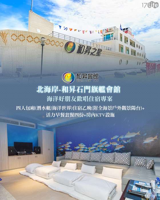 只要2,400元(四人價)即可享有【北海岸-和昇石門旗艦會館】原價4,000元海洋好朋友歡唱住宿專案:四人包廂(潛水艇/海洋世界)住宿乙晚(附全海景戶外觀景陽台)+活力早餐套餐四份+房內KTV設施?1AE700A607415E24